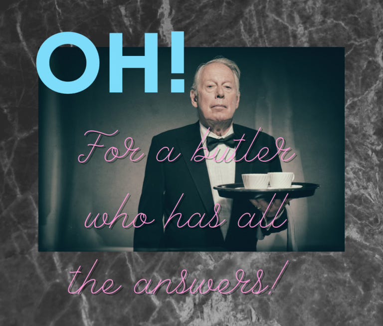 So – avoid responsibility, romantic entanglements, and financial conundrums. Fear marriage and anyone in uniform. Pursue amusement, particularly if a practical joke will end in what Bertie’s chums call a “good wheeze.” Fraternize with like-minded adult males who, despite their elevated social standing, aspire to remain boys. Encourage food fights, but only with dinner rolls so as not to create a mess for which responsibility would have to be assumed. Coordinate rugby scrums in the clubroom, but only if fragile crockery has first been cleared. Solving real-world problems (such as romantic entanglements) by way of practical jokes and stratagems might not work but it’s always worth a good try.